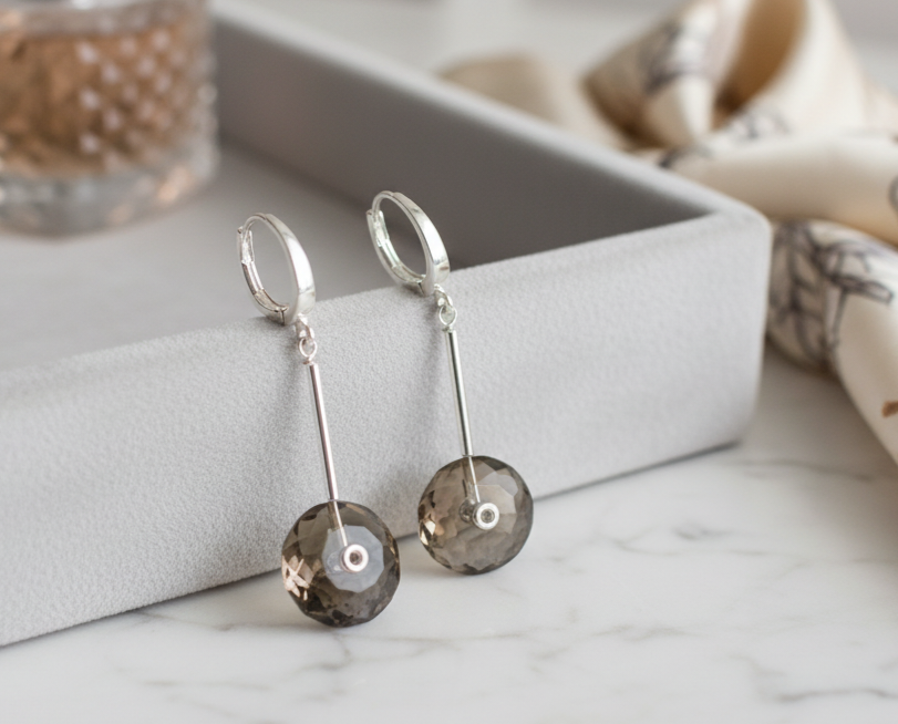 Suitsukvartsiga hõbekõrvaõrngad, inglise lukuga. Pikkus 4cm, kaal 5.62g.