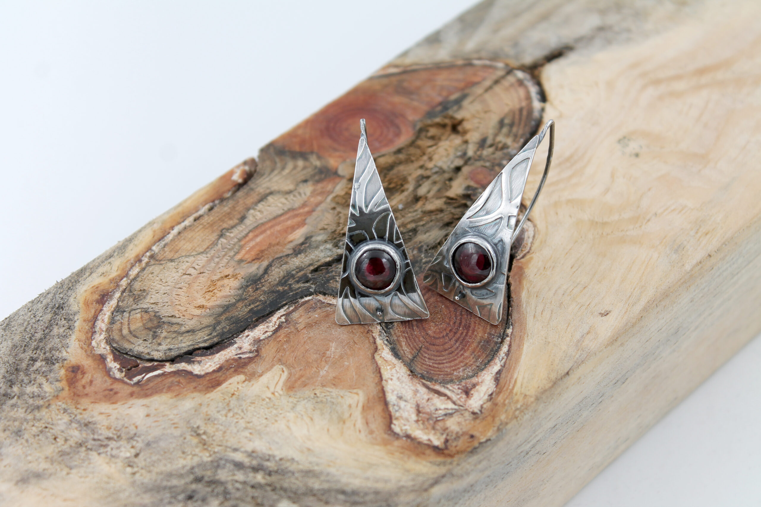 Hõbekõrvarõngad – suured kolmnurgad granaadiga