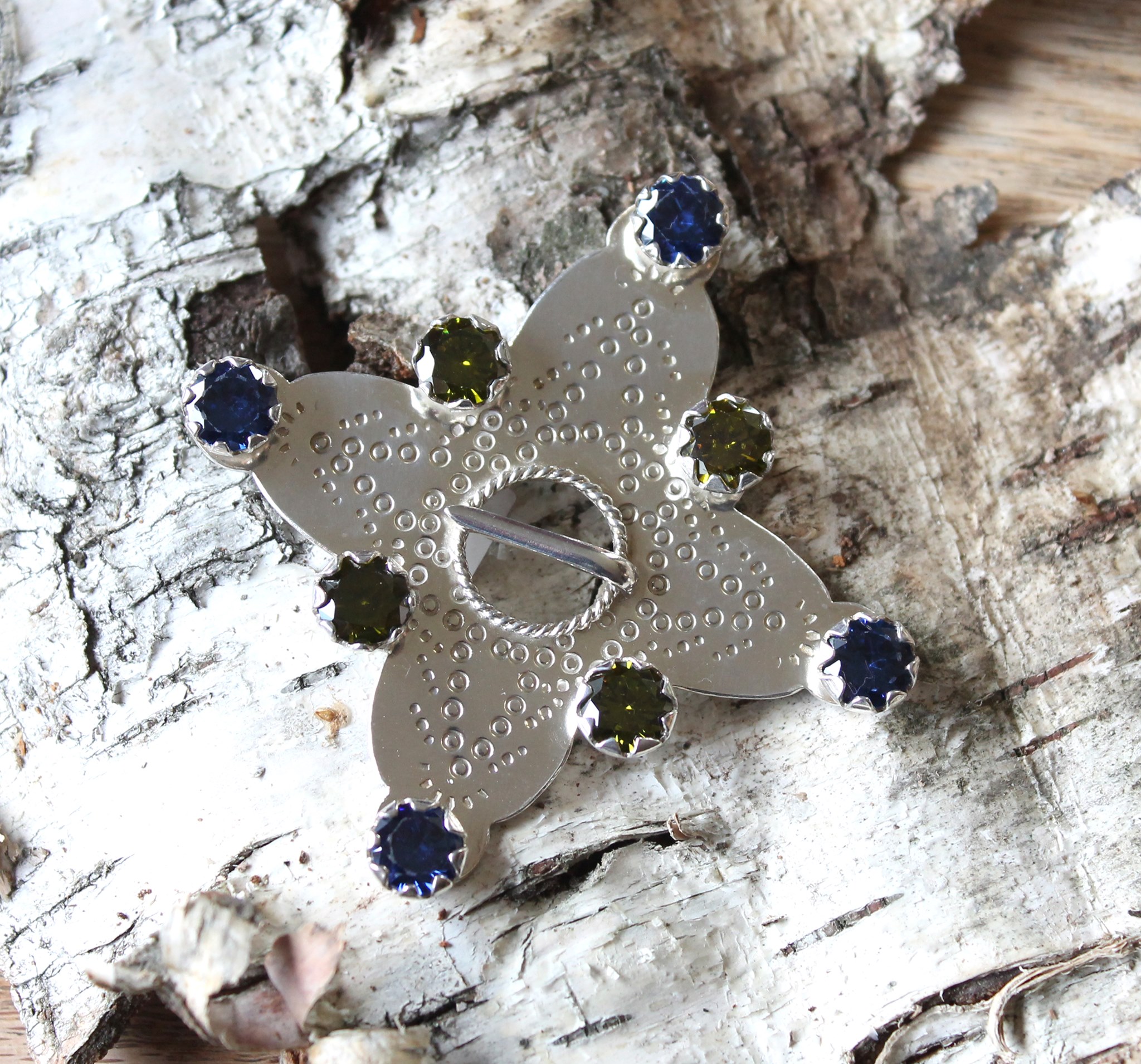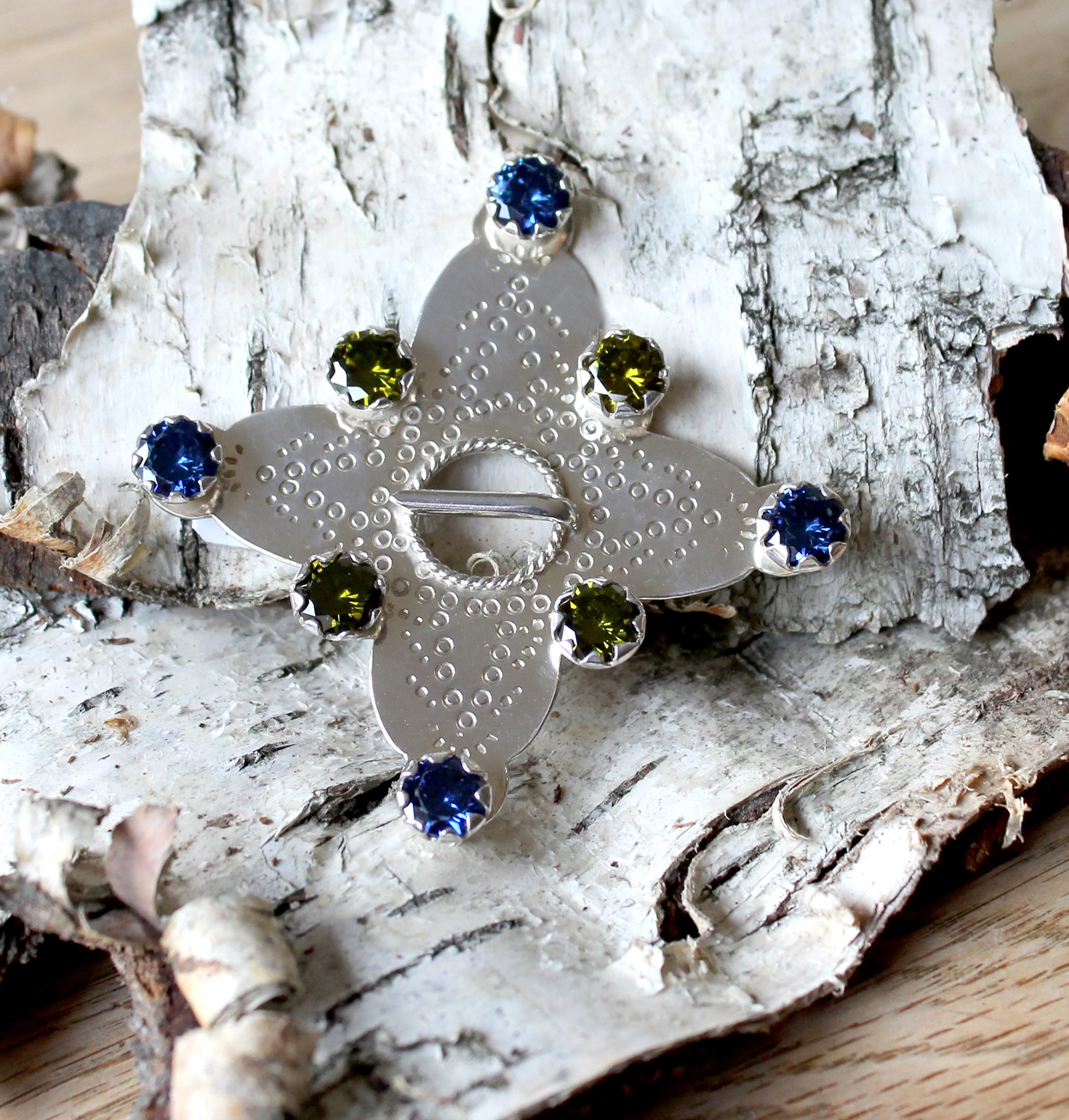 925 hõbedast prees siniste ja rohelisete 8mm tsirkoonidega. Preesi mõõt Mõõt 7x7cm, kaal 20,5g