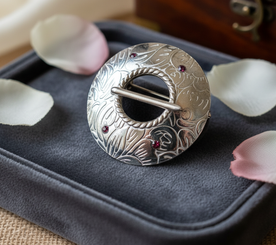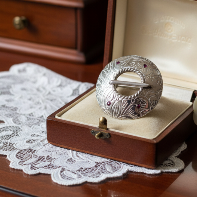 Vormilt kompaktne ja detailirohke hõbesõlg, mille peen mustrilahendus ja väikesed punased tsirkoonid lisavad ehtesse särava ja väljendusrikka aktsendi. Ornamentne pind loob visuaalset rütmi ning toob esile sõle isikupärase ilme ilma liigselt domineerimata.
